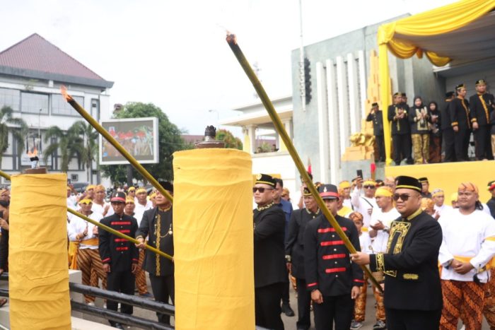 Usai prosesi sakral tersebut, dilakukan penyalaan brong (obor besar) di halaman Keraton/Museum Mulawarman oleh Kerabat Kesultanan, Forkopimda Kaltim dan Kukar. (adv/gs/Diskominfo Kukar)