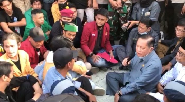 Mahasiswa akhirnya mau berdialog dan bersedia diterima Ketua DPRD Kaltim Makmur HAPK di depan pintu masuk Kantor DPRD Kaltim.